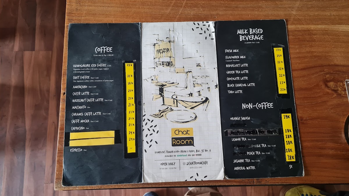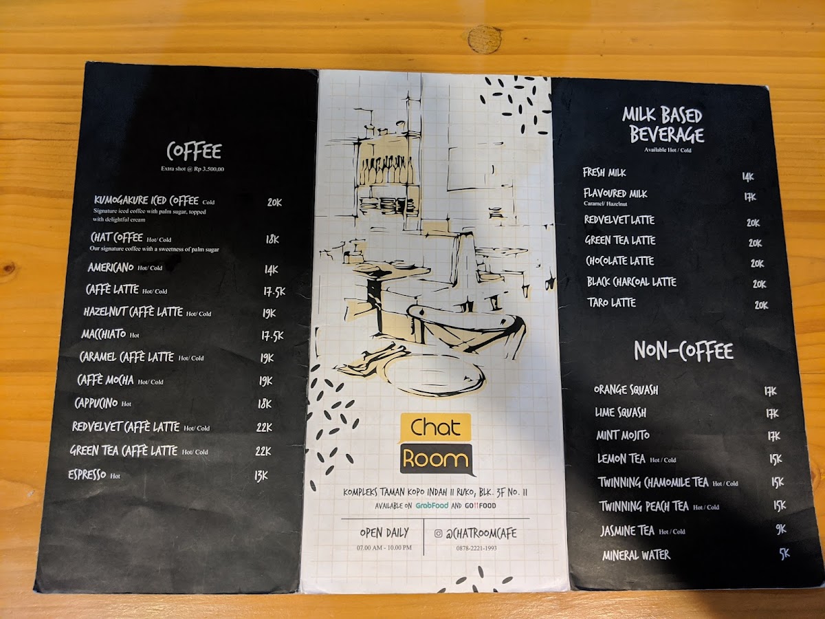 Welcome to Chatroom Café, a cozy haven tucked away in Bandung, where the aroma of freshly brewed coffee mingles with a warm, inviting atmosphere. The menu is a delightful blend of beverages and comforting dishes. Indulge in their signature Chat Coffee, featuring a sweet, savory flavor from palm sugar, or opt for a classic Americano if you prefer a bold black coffee. The rich Caffe Latte and decadent Caffè Mocha are perfect for those who savor creamy textures.
